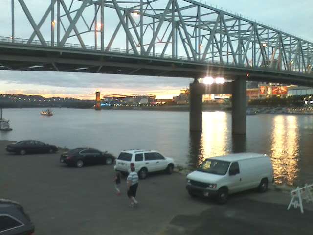 We drove over to Newport and made a stop at The Party Source. They have a great gift section and a lot of really cool foods. We also like looking at the many different kinds of wine and always think how fun it would be to sample them. From there we went over to Newport on the Levee and took a walk along the river and then on the Purple People Bridge. While walking we saw people dressed in all sorts of crazy costumes and found out they were there for the Cincinnati Beer Run. After more walking we stumbled upon the Newport Oktoberfest. There was also a Reds game going on across the river. In other words, there was a lot going on along the riverfront last night and we soaked it all in. The photos below show my lovely date for the evening and some not-so-good pictures of the sunset across the river (Cruddy cell phone cameras). Money is a bit tight right now, so we didn't want to go out for an expensive dinner. This walk along the river and the accompanying festivities were free. The weather was perfect, the backdrop was gorgeous and the company was divine. A wonderful evening all around.